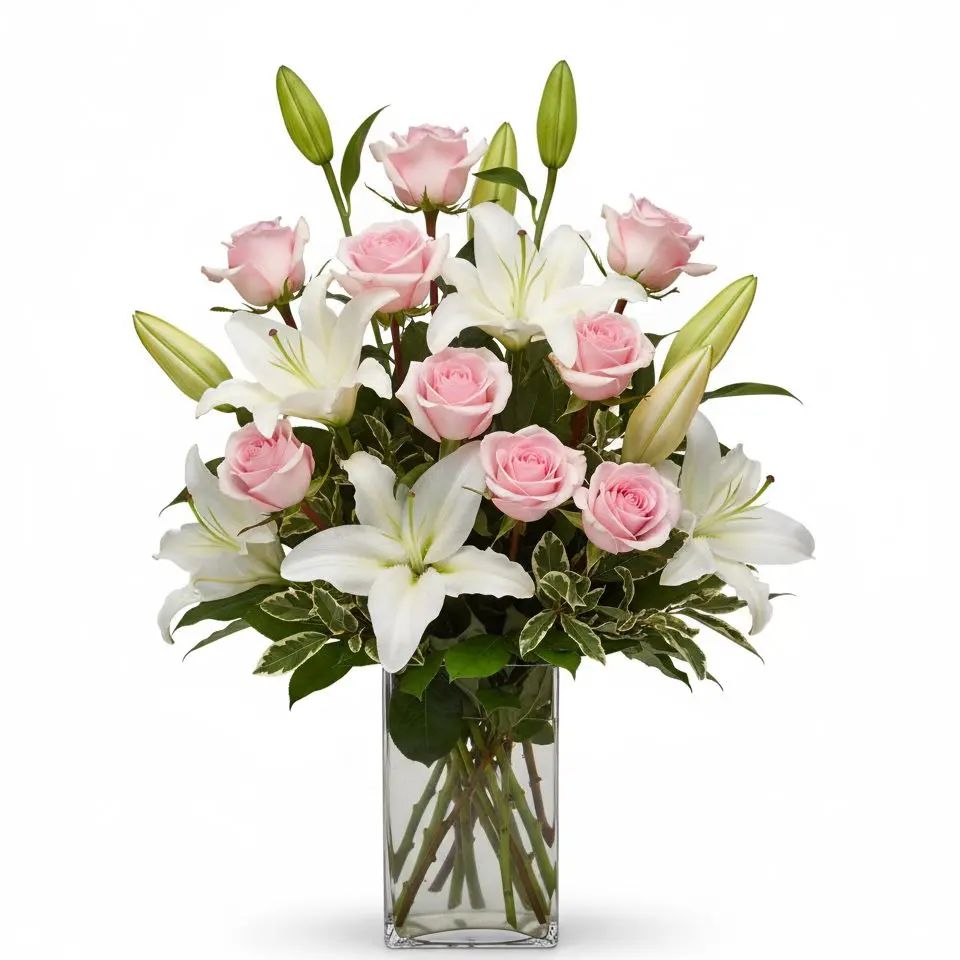 Experience the luxurious embrace of our 'Velvet Petal Romance' bouquet, a stunning arrangement crafted with exquisite Oriental Lilies and delicate Roses. Enhanced by fresh Pittosporum, this captivating floral design brings joy and elegance to any setting. Celebrate life's beautiful moments with this truly unforgettable gift.