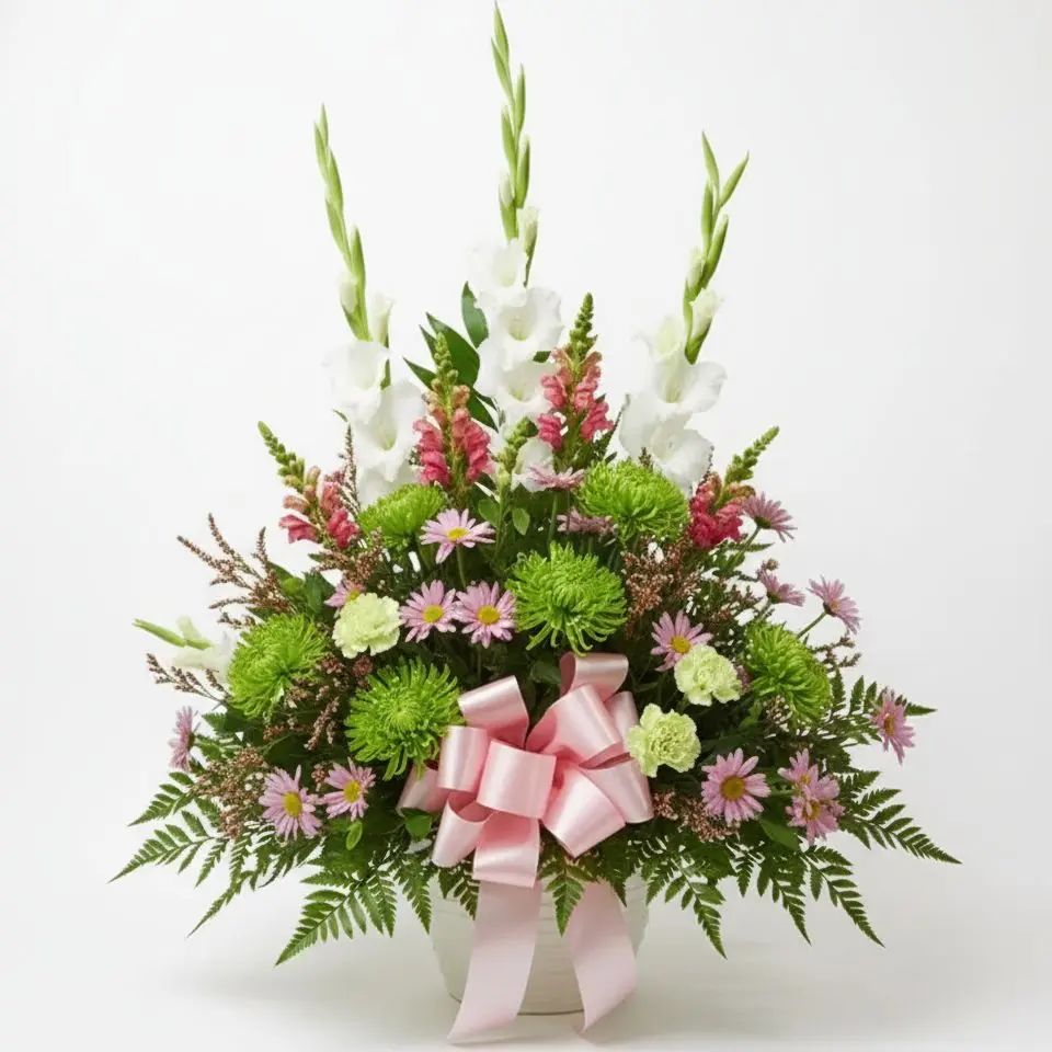 Experience the soothing beauty of "Garden's Gentle Embrace," a delightful bouquet featuring a harmonious blend of green spider mums, white gladiolas, and charming lavender daisy poms. Delicate pink snapdragons and waxflowers add a touch of romance, creating a truly uplifting visual treat. This arrangement brings the fresh tranquility of a secret garden right into your home or to a cherished loved one.